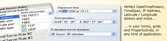 The Microsoft DateTimePicker has poor usability and a minimalist API. SFPE is its best possible replacement for .Net. Forget about all those unsatisfying solutions based on Microsoft DateTimePicker derived classes or textboxes, masked or not! Instead, use a powerful component designed to furnish your end-users with field based editors. It offers the following features: